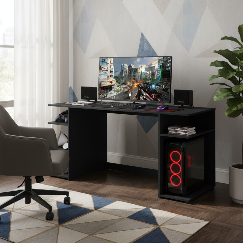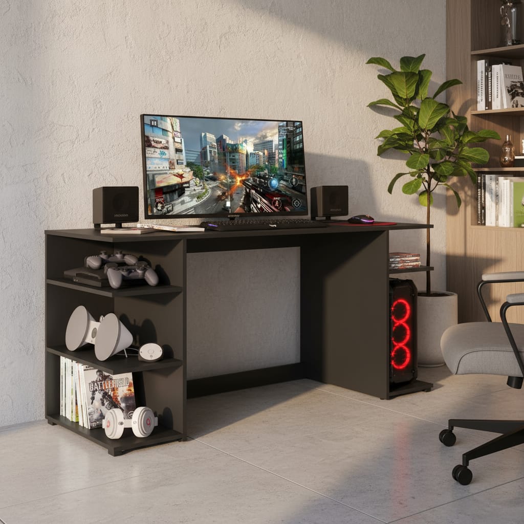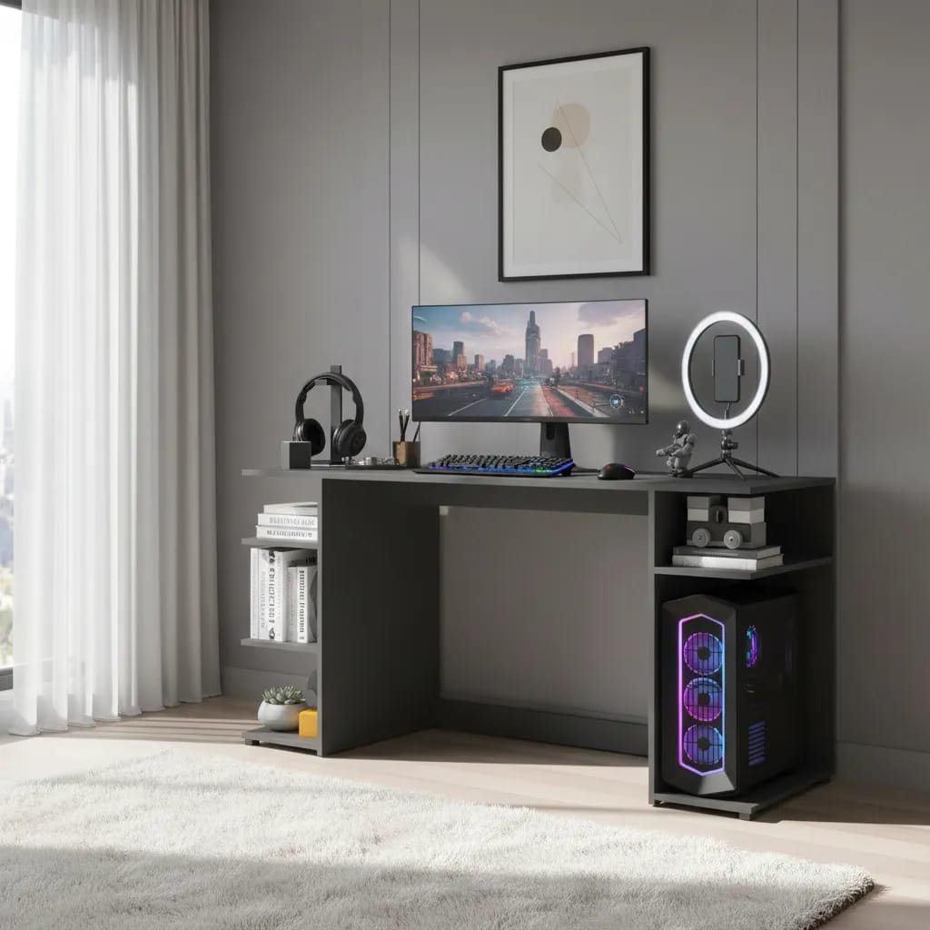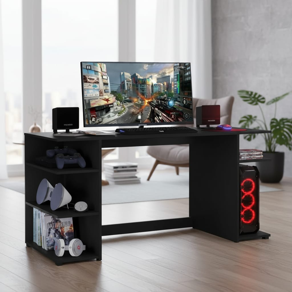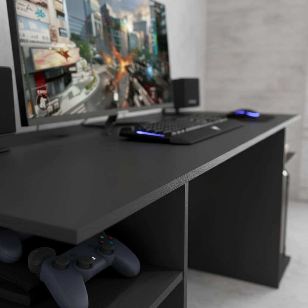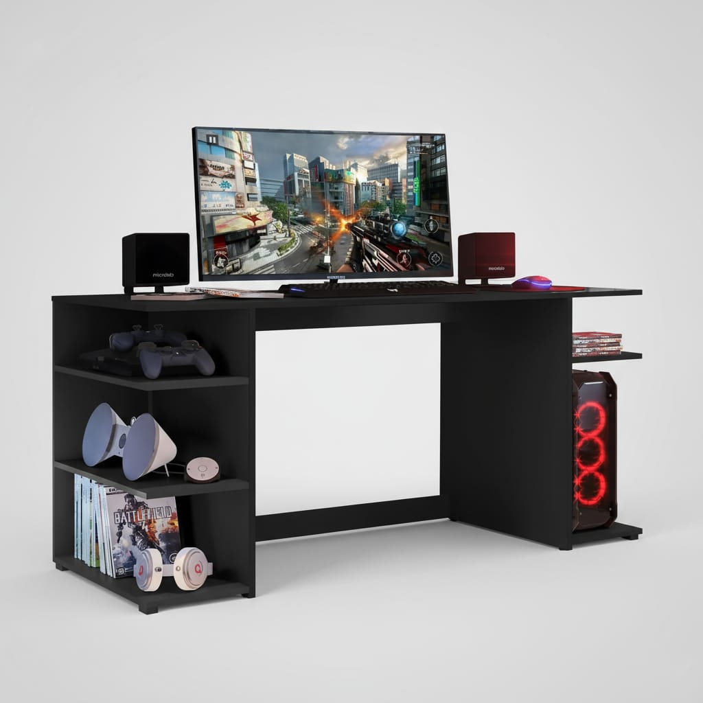 Fabricado en MDP de 15 mm, este escritorio garantiza durabilidad y resistencia, ideal para soportar largas horas de uso. Su diseño no incluye cajones ni biblioteca, lo que permite un aspecto limpio y minimalista, perfecto para cualquier configuración de gaming. Además, su estilo moderno se adapta a diferentes ambientes, ya sea en casa o en una oficina.