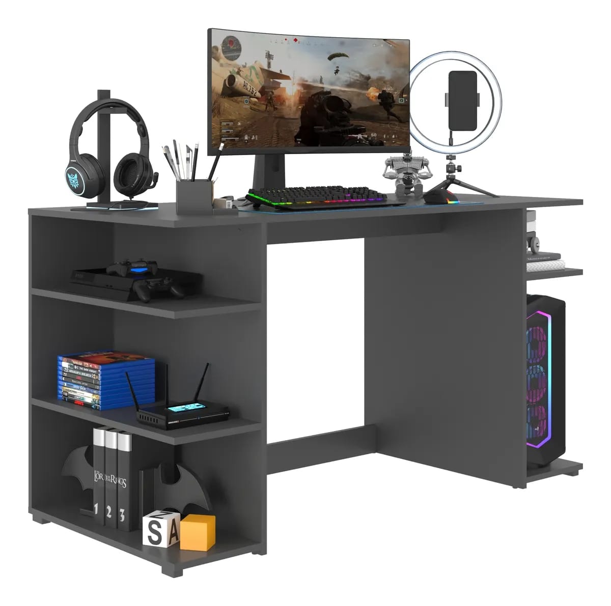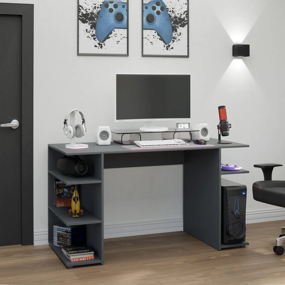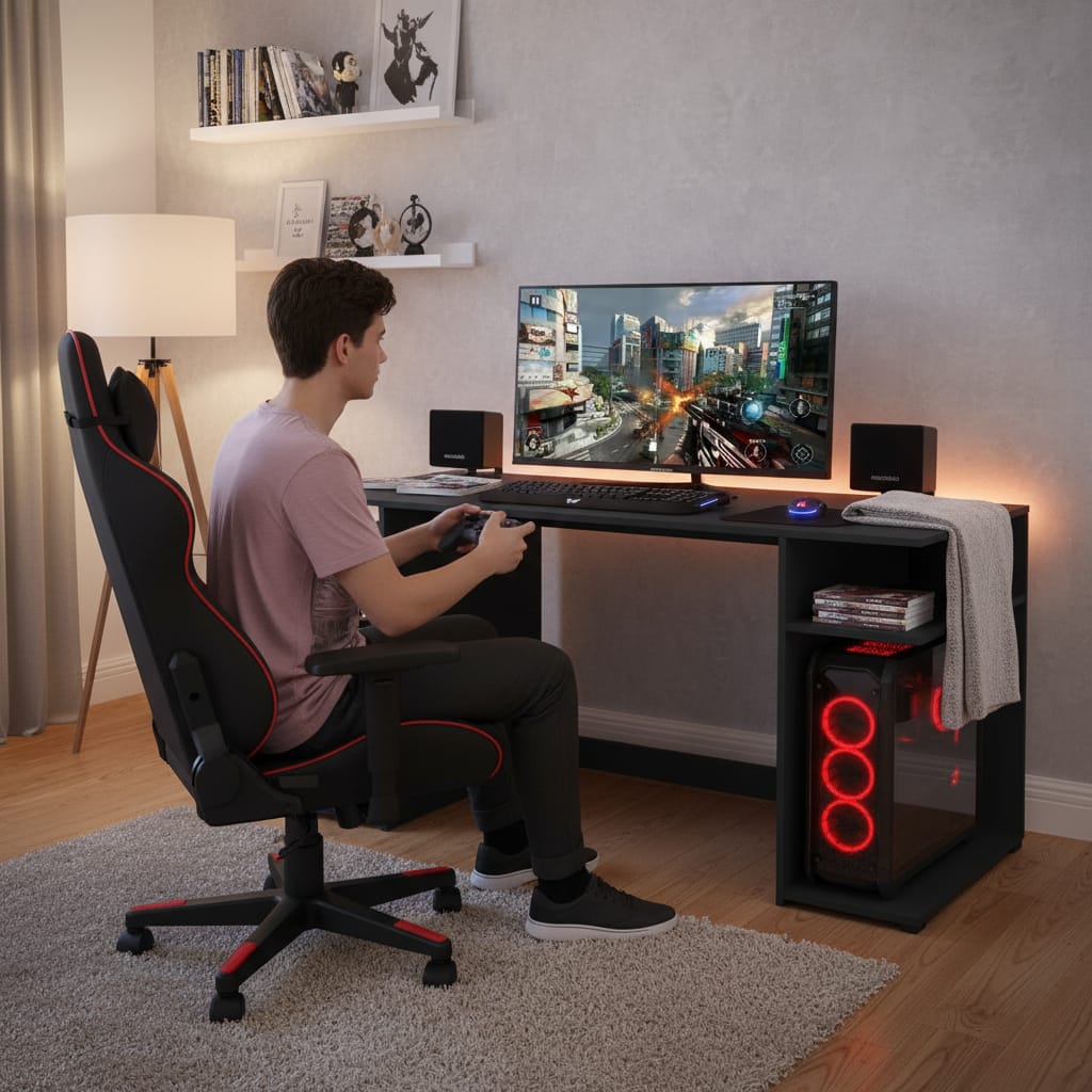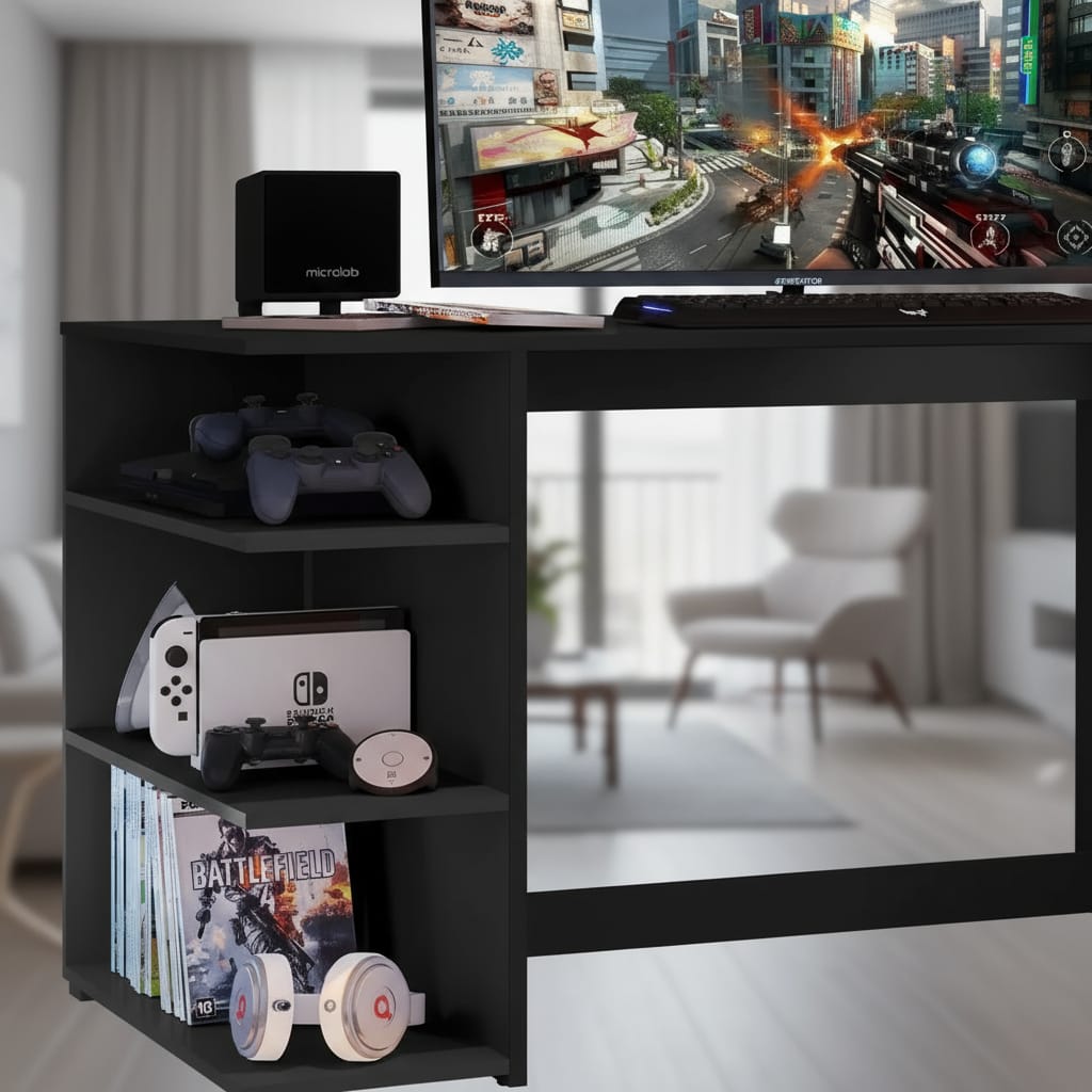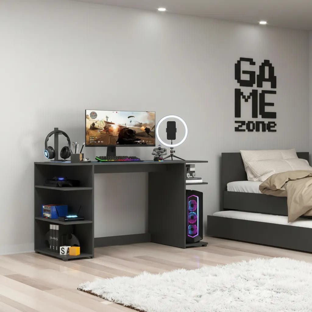 Fabricado en MDP de 15 mm, este escritorio garantiza durabilidad y resistencia, ideal para soportar largas horas de uso. Su diseño no incluye cajones ni biblioteca, lo que permite un aspecto limpio y minimalista, perfecto para cualquier configuración de gaming. Además, su estilo moderno se adapta a diferentes ambientes, ya sea en casa o en una oficina.