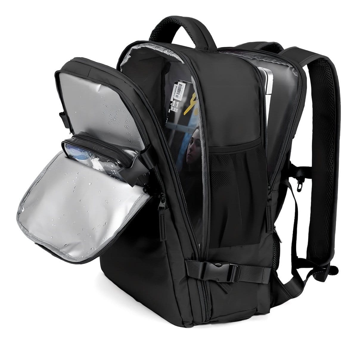 El cierre principal es con cierre de cremallera. Cuenta con correa de pecho para mejor sujeción; no incluye correa abdominal ni correa para equipaje. No tiene ruedas. Modelo: Large Travel Backpack. Tipo de mochila: viaje. Género: sin género.
